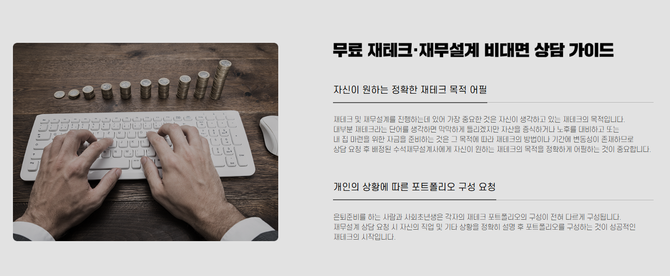 : 한국 내무컨설팅센터의 무료 재테크/재무설계 비대면 원격상담 서비스는 지역/날씨/시간에 제약 없이 개개인에게 필요한 모든 분야의 가장 안전하고 효율적인 재테크 상담 및 포트폴리오를 제공바들 수 있습니다.